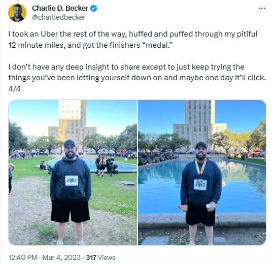 I wasn’t fit, I wasn’t prepared, and I didn’t want to do it. I even got a flat tire on the day of—but I still Ubered to the race location and did it. It wasn’t a great time—hell, it wasn’t even a good time. But I did it. I plan to do more. Check out the full thread on Twitter here and see the last pictures here below.