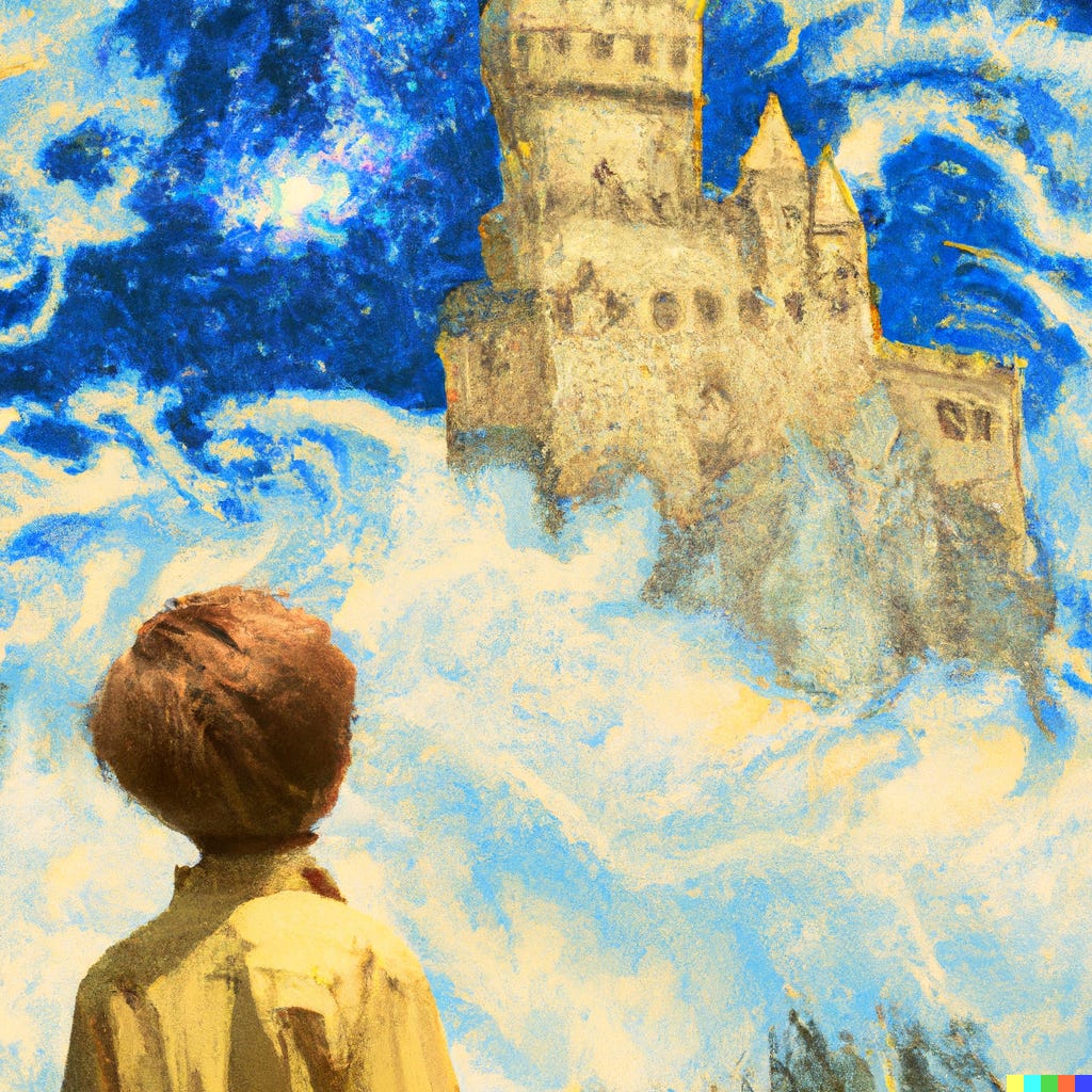 But seeing castles in the sky is not an idea or a lesson–it is not something entirely intellectual. It is more sensual. It teaches you something, but transcends memorization or association: it is often something from nothing. More often than not, people who embark on journeys of self-discovery do so after seeing a castle in the sky. People who change the world and do great, enviable things often do so after seeing a castle in the sky.