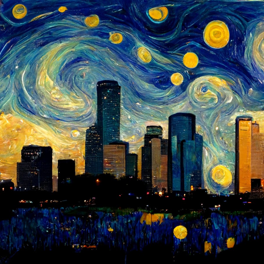 houston skyline, starry night, van gogh